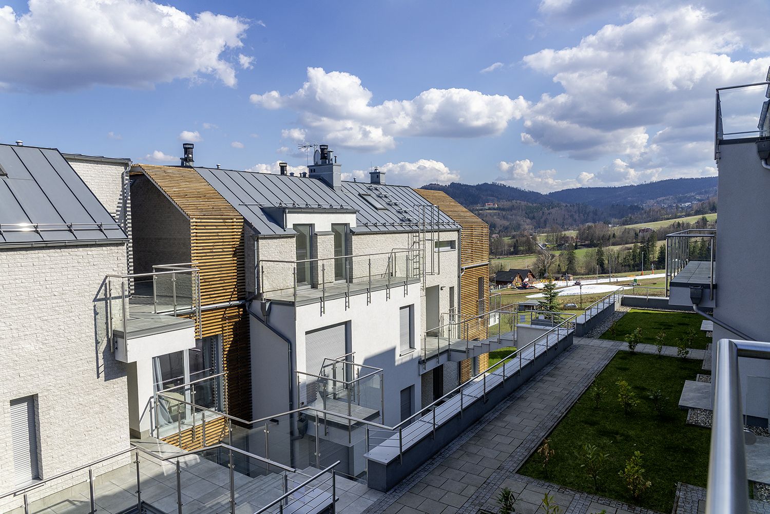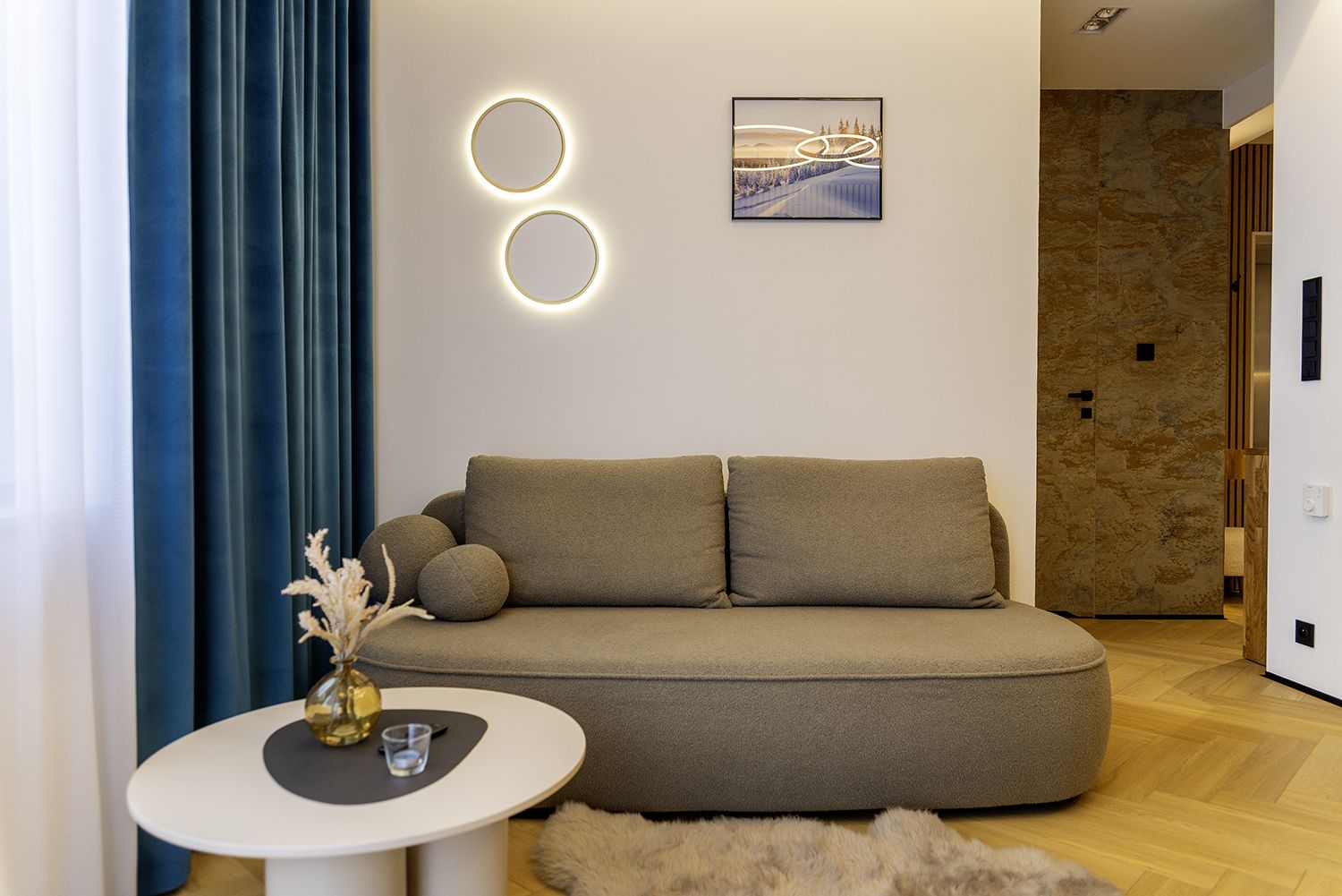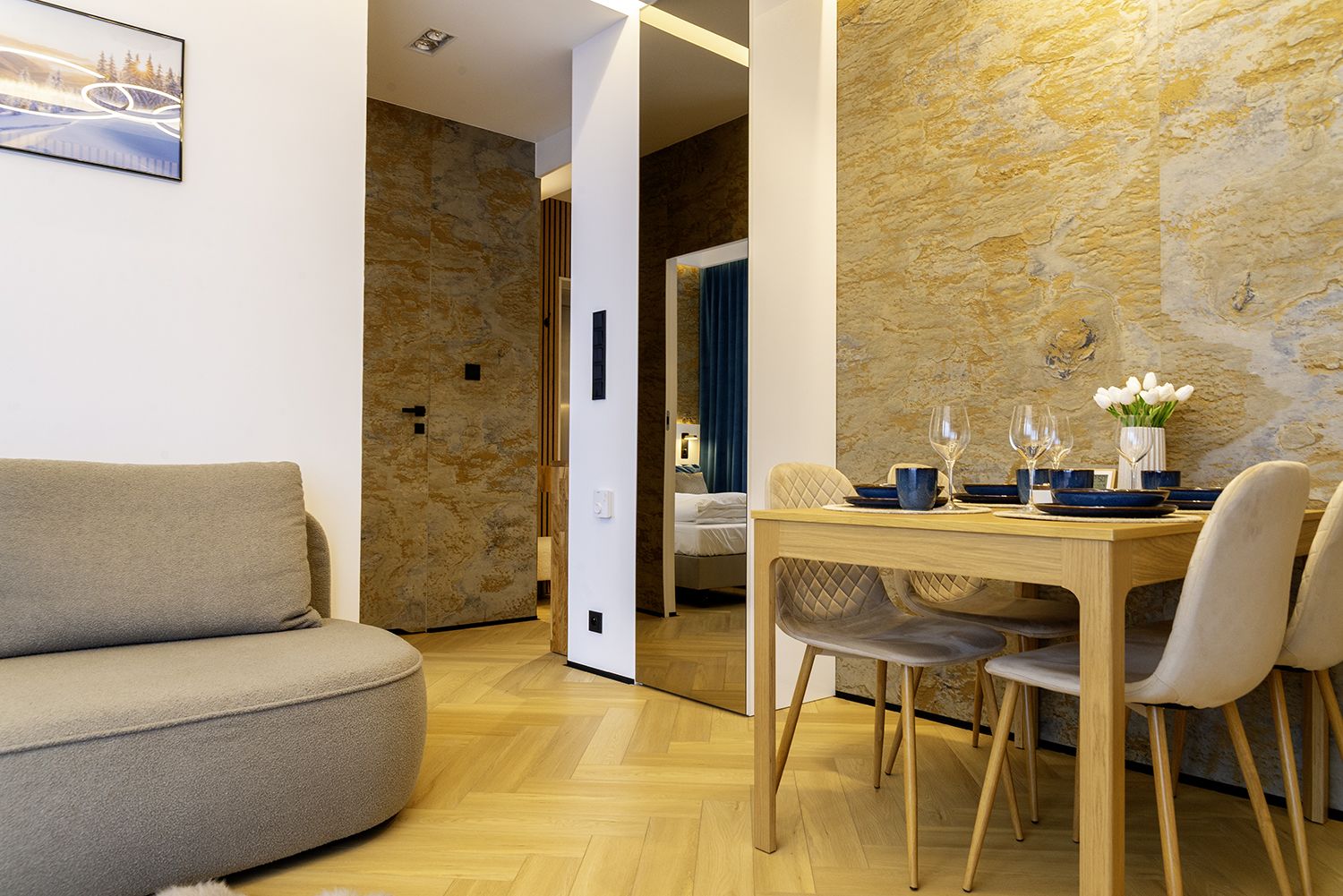 Apartament Ski & View to wyjątkowa propozycja dla osób szukających komfortowego i stylowego miejsca do wypoczynku w sercu Beskidów. Zlokalizowany u podnóża stoku Siglany, co czyni go idealnym punktem wyjścia zarówno do zimowych sportów, jak i letnich wędrówek. Wnętrze apartamentu zostało zaprojektowane z wykorzystaniem nowoczesnego designu z dbałością o każdy szczegół. Znajdziemy w nim przestronny salon z wyjściem na taras, stół dla 4 osób, rozkładaną sofę oraz TV. W pełni wyposażona kuchnia i elegancka łazienka z prysznicem gwarantują wygodę i komfort użytkowania, a zastosowane materiały wysokiej jakości – drewno, kamień czy szkło – dodają wnętrzu ciepła i elegancji. Apartament posiada jedną samodzielną sypialnię z dwoma pojedynczymi łóżkami z funkcją łączenia. Apartament posiada przypisaną komórkę lokatorską w garażu budynku, którą wykorzystywać można jako przechowalnię sprzętu sportowego. Łącznie 4 miejsca noclegowe.